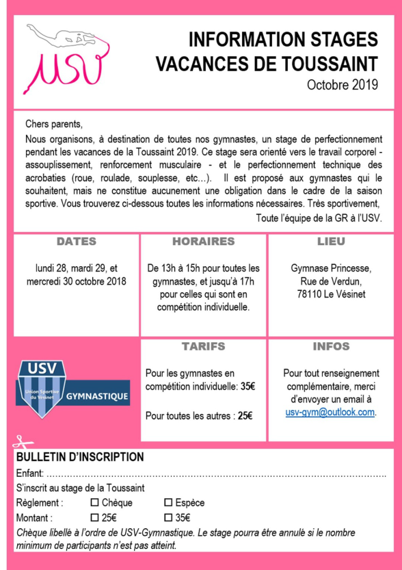 Du 28 au 30 octobre 2019, nous organiserons au gymnase Princesse un stage de perfectionnement à destination de toutes nos gymnastes. Ce stage sera orienté vers le travail corporel - assouplissement, renforcement musculaire - et le perfectionnement technique des acrobaties (roue, roulade, souplesse, etc…). Il permettra également aux gymnastes en compétition de perfectionner leur enchaînement.