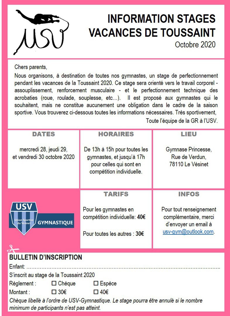 Du 28 au 30 octobre 2020, nous organiserons au gymnase Princesse, un stage de perfectionnement à destination de toutes nos gymnastes, ainsi qu'à toutes les jeunes filles souhaitant découvrir la Gymnastique Rythmique.