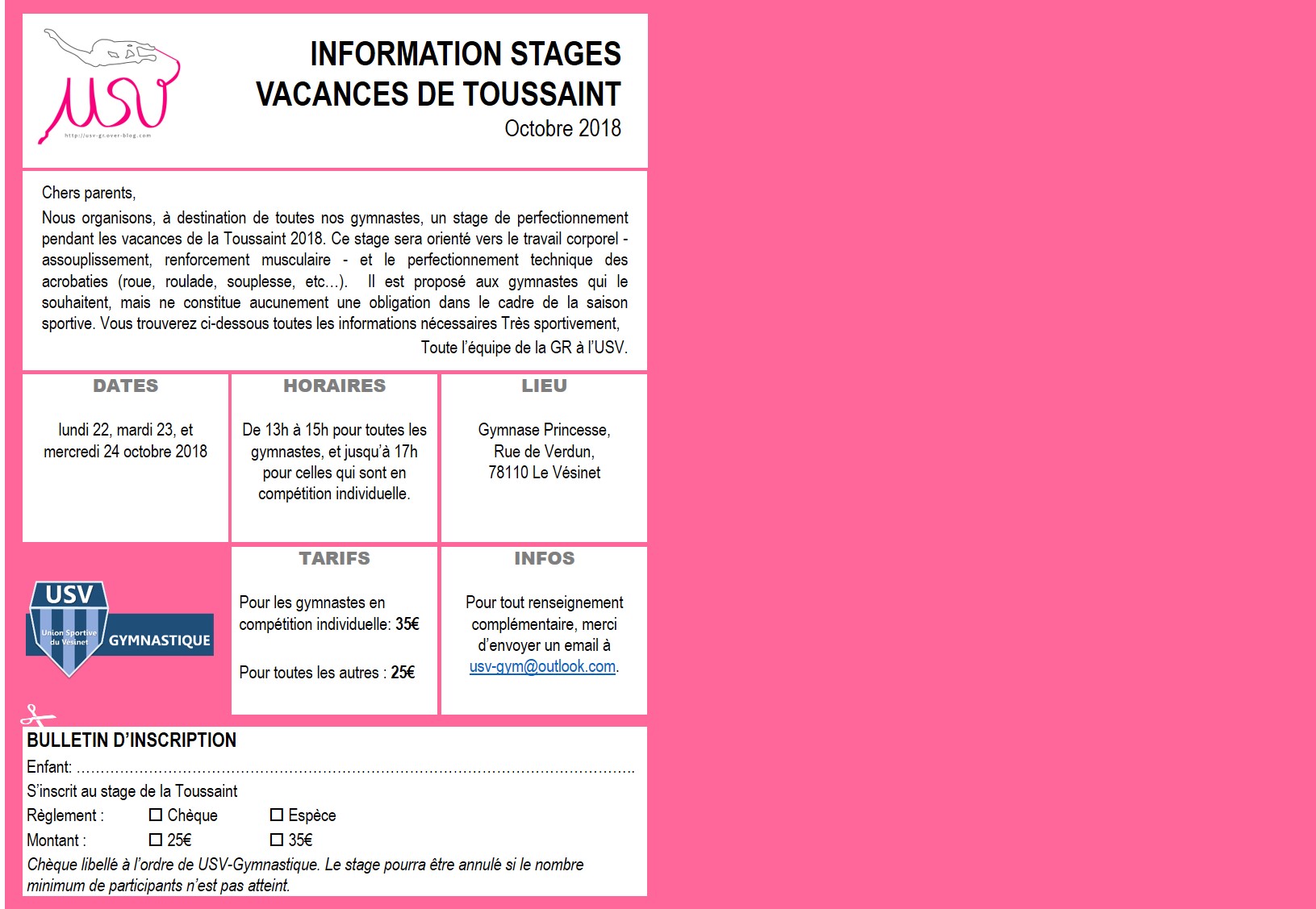 Les 22, 23 et 24 octobre 2018, nous organiserons un stage de perfectionnement à destination de toutes nos gymnastes. Ce stage sera orienté vers le travail corporel - assouplissement, renforcement musculaire - et le perfectionnement technique des acrobaties (roue, roulade, souplesse, etc…). Il est proposé aux gymnastes qui le souhaitent, mais ne constitue aucunement une obligation dans le cadre de la saison sportive.